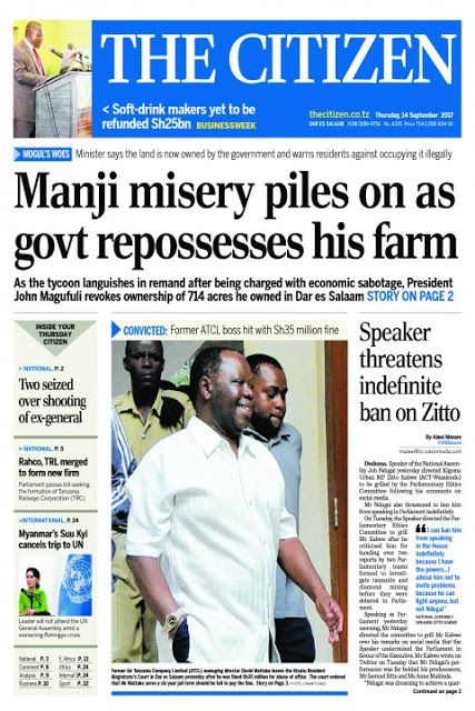 Magazeti ya Leo Alhamis ya tarehe 14/09/2017
